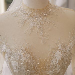Classic gown with exposed corsetry, metallic lace yoke and full layered tulle skirt.